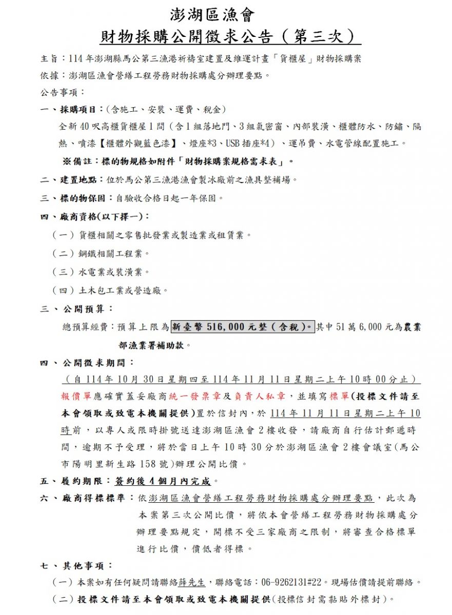 114年澎湖縣馬公市第三漁港祈禱室建置及維運計畫「貨櫃屋」財物採購案第三次公開比價