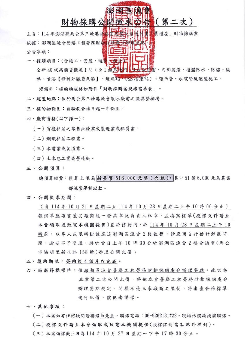 114年澎湖縣馬公市第三漁港祈禱室建置及維運計畫「貨櫃屋」財物採購案第二次公開比價